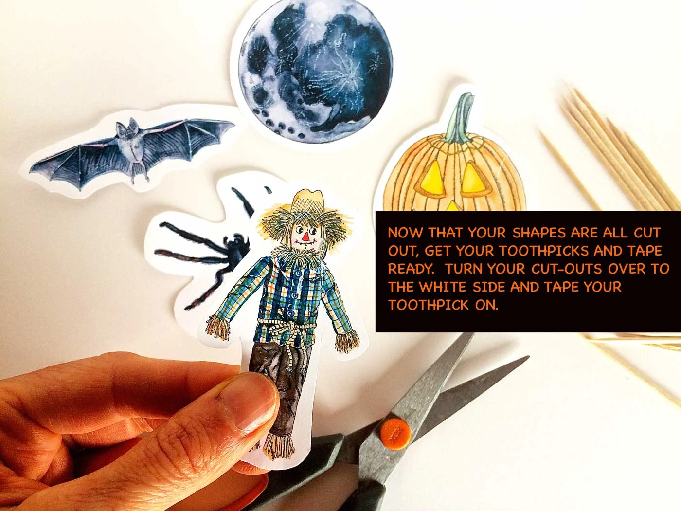 Now, turn over your cut-out to the white side. Get a small piece of tape, and tape your toothpick to the cut-out as shown in the photo below.