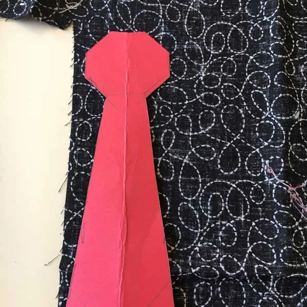 I know this is a little hard to see but I have traced the template onto the fabric in white. Next I will get a nice sharp pair of scissors and carefully cut out the tie shape.