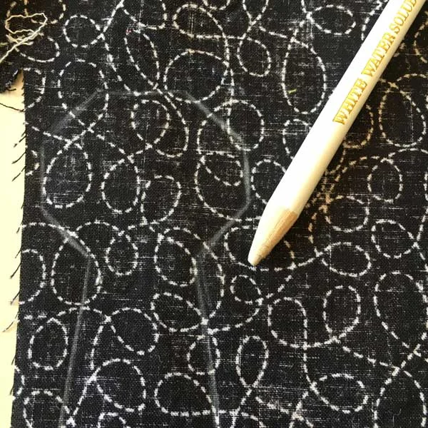 Here is my piece of card stock, all cut out. You may choose to pin the fabric onto your template to keep it from slipping while tracing it but I just winged it. There are special markers you can buy in which the ink will disappear or wash off but I used a white pencil on the black fabric. You can use what you have at home but just be careful about markers that might bleed through the fabric. I have used pens, mechanical pencils, and whatever is within reach!