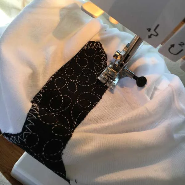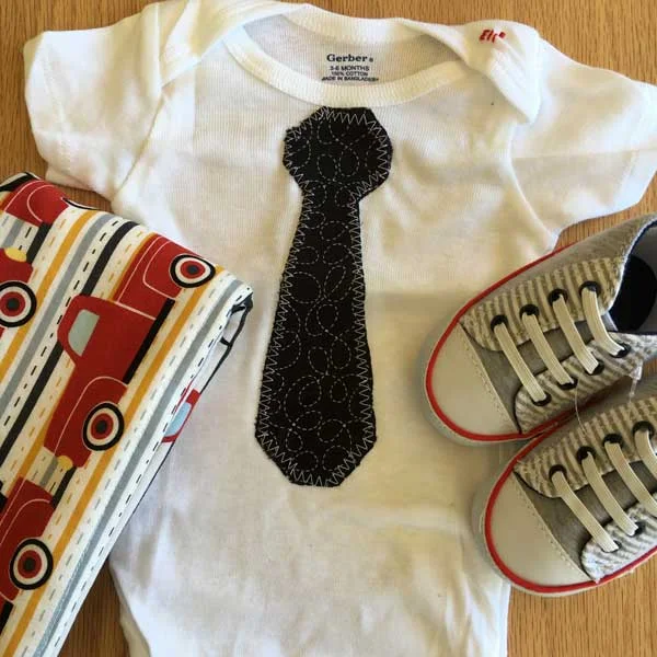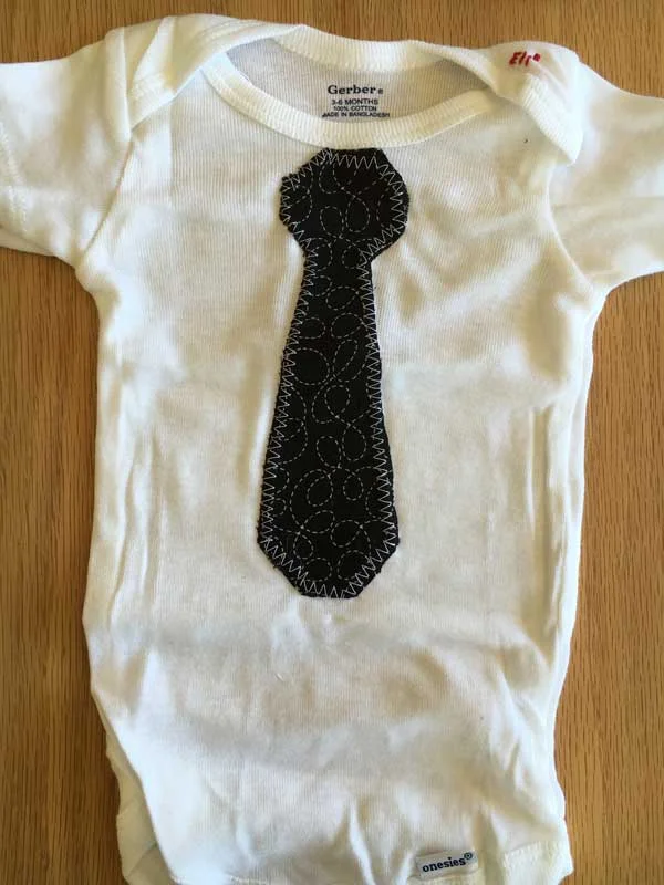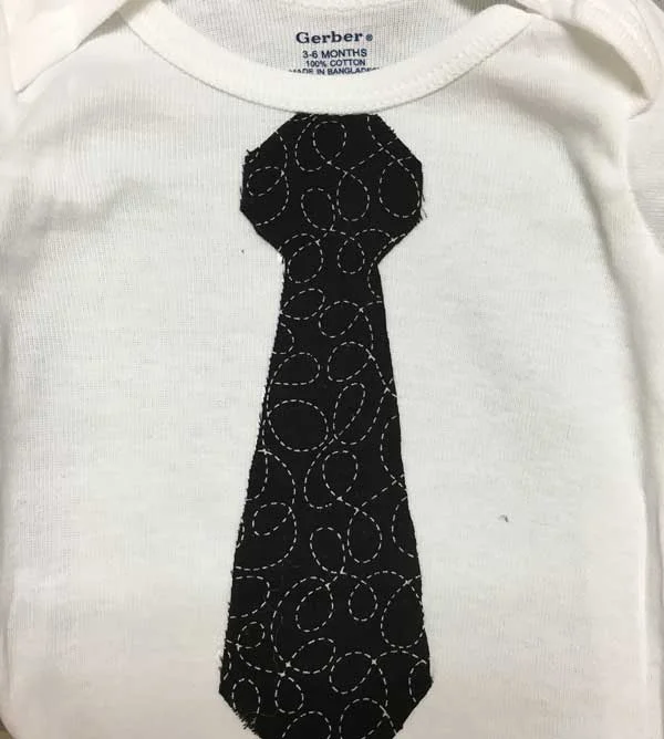 STEP 4: Now that you have adhered the tie to the onesie, you can really just stop here. The tie will stay in place with the glue but I like to add some stitching around the edges for a more finished look.