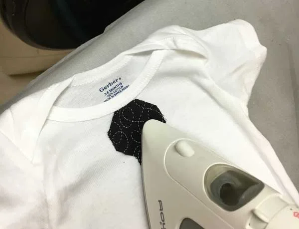 I first iron my onesie flat and then play around with the tie until I have it where I want it. Then I get my iron and run it over the tie several times until the adhesive has melted and bonded.
